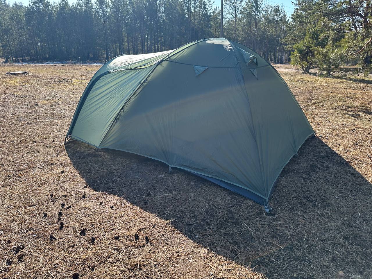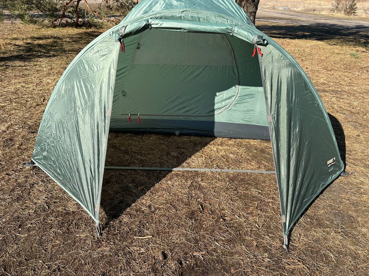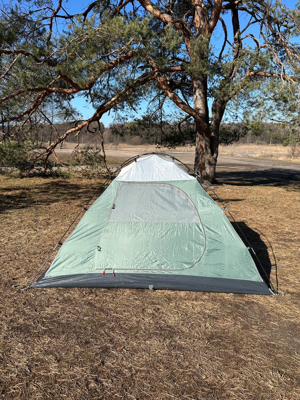 Дана палатка є двошаровою,має захист від опадів до 2000мм, водного стовпа і каркас зроблений з гнучких дуг.